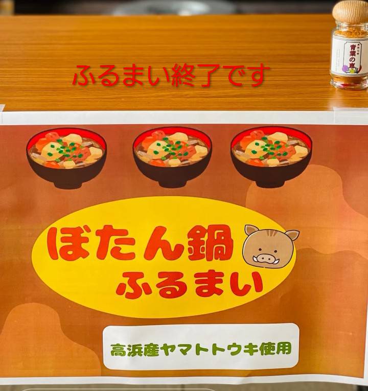 ・『ぼたん鍋』ヤマトトウキで出汁をとり、猪肉とたっぷりの野菜で煮込んだお鍋のふるまいをさせていただきました。